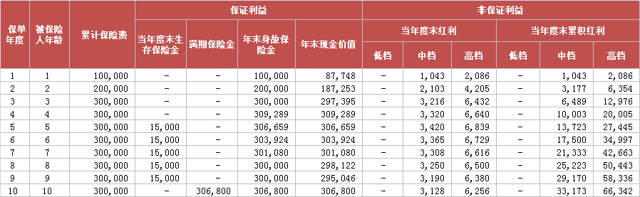 4.如上利益演示是基于公司的精算及其他假设,不代表公司的历史经营业绩,也不代表对公司未来经营业绩的预期,保单的红利分配是不确定的,在某些年度红利可能为零。