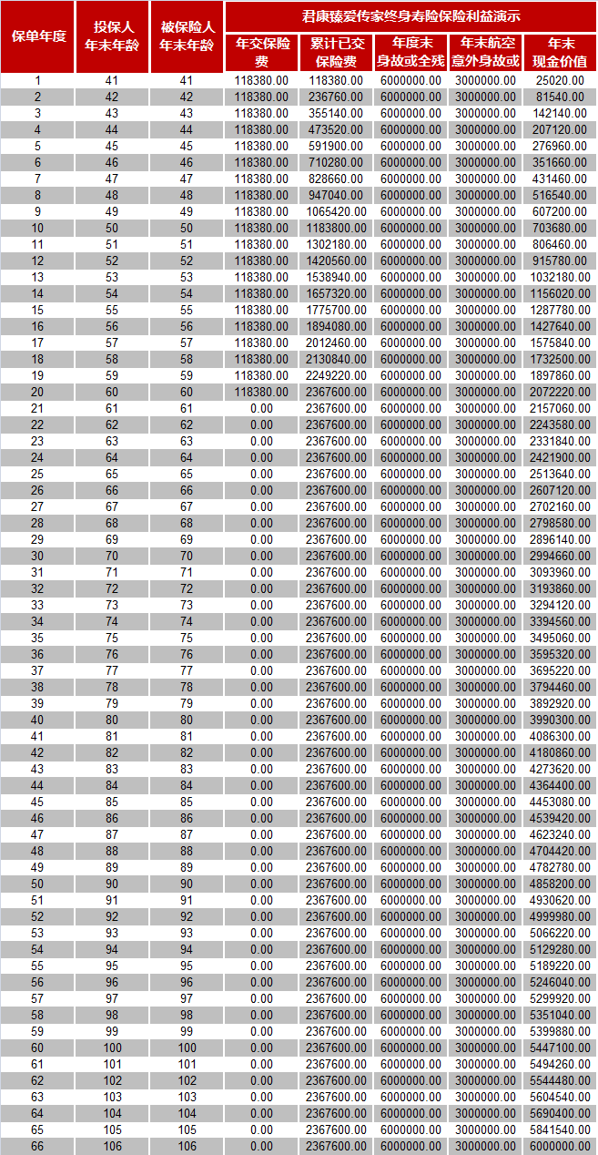 3.身故保险金、现金价值为保单年度末数值,不同时点的数值不同。具体身故保险金给付额度以身故时点的计算值为准,与年末数值不同。